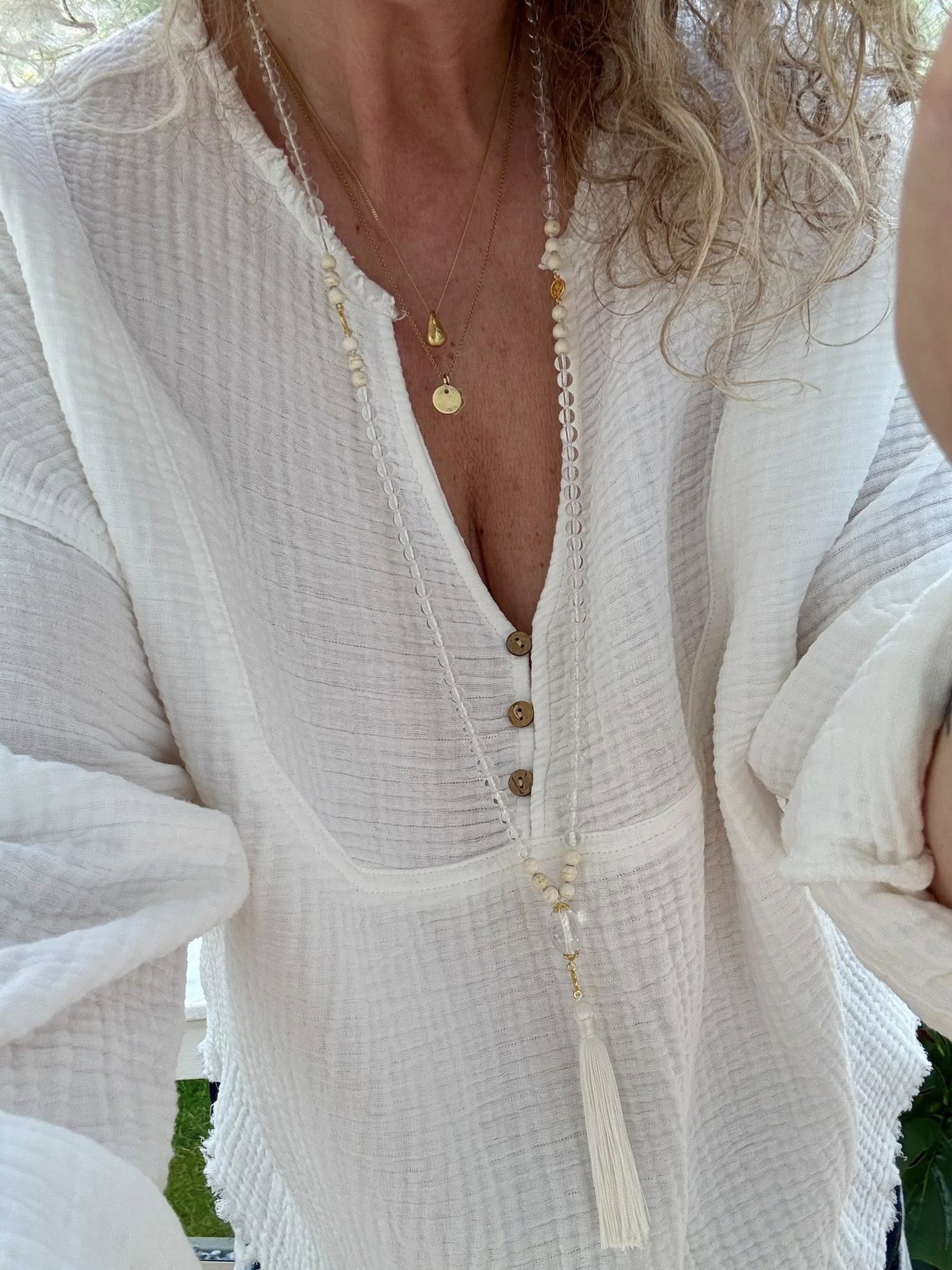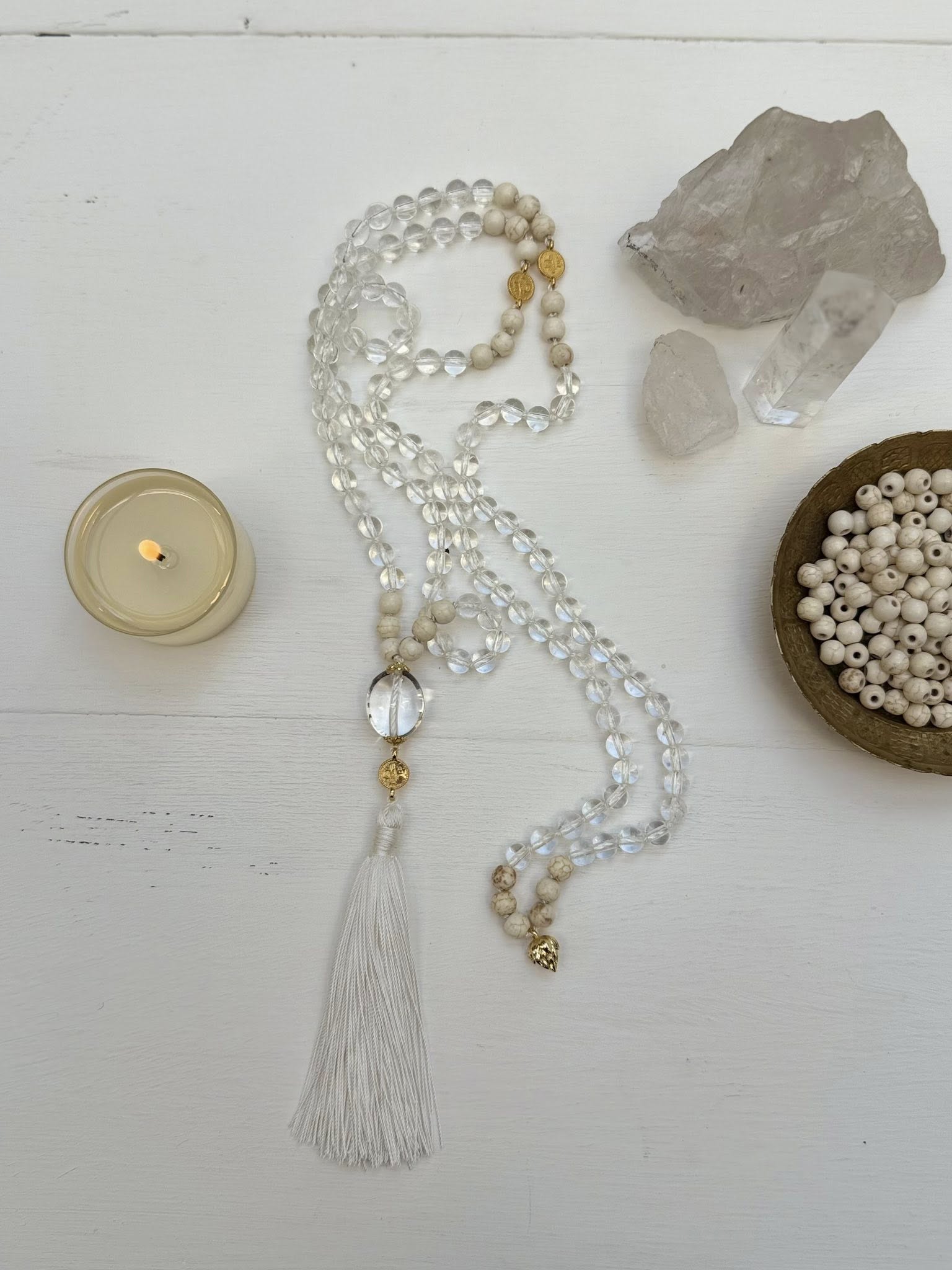 Email to a friendZierliche und gleichzeitig kraftvolle Bergkristall Mala aus 108 + 1 Bergkristall (große Meruperlen Olive) Perlen und zusätzlichen Magnesit Counter Perlen und vergoldeten Details.